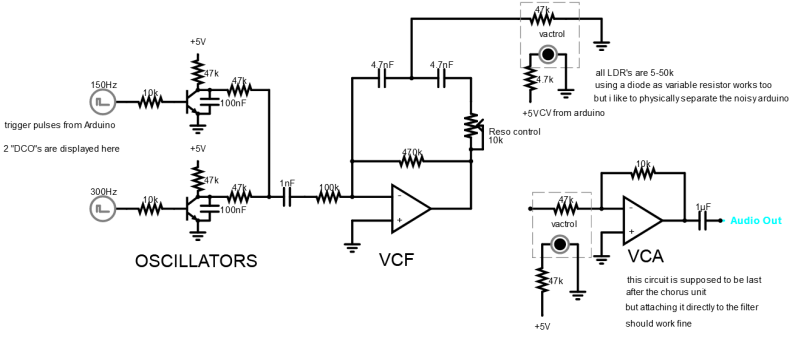 The 2 low-pass filters and VCA's are both controlled through PWM, driving an LED + LDR vactrol. See schematics below.