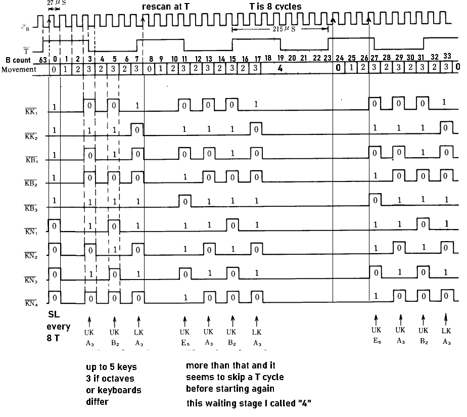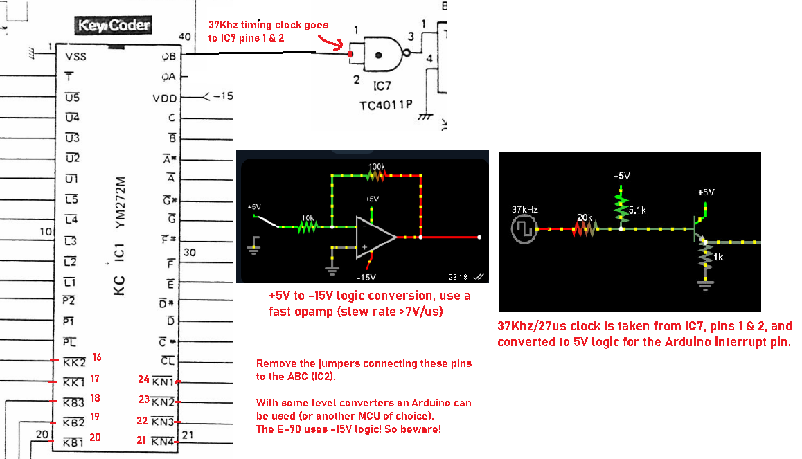 I've added a diagram of the KC data, with timing and counters. This will act as a reference guide to the Arduino Uno code I've written: download. This code is only for the MIDI -> key code conversion as my E-70 project has no keyboards.
