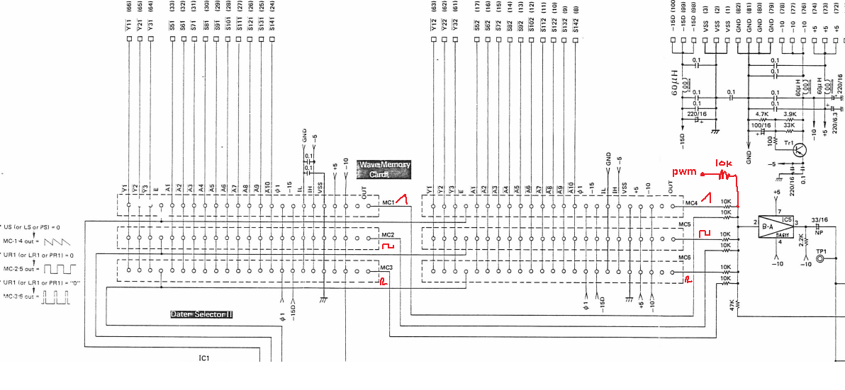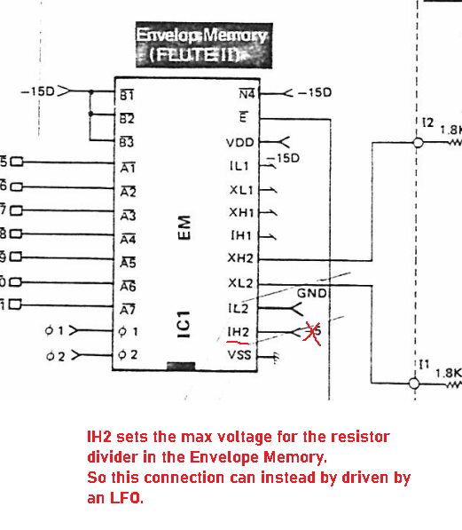 Alternatively the envelope memory IC can have the same thing done to it, to modulate all waveform generators all at once in an easier way. See the Flutes AM mod below.